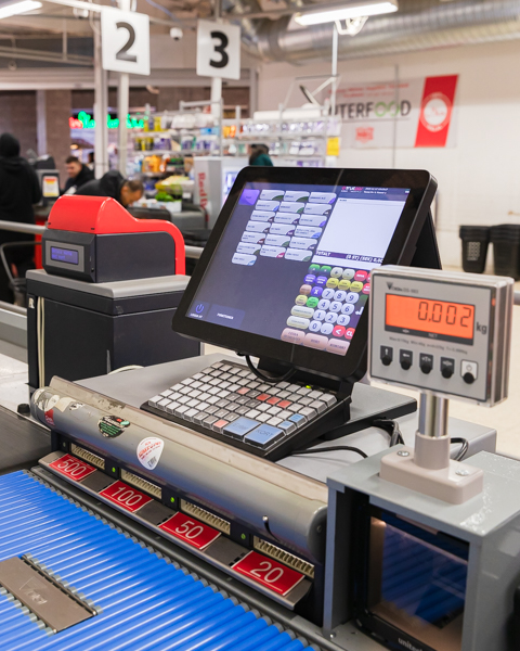Butiken har 4 kassalinjer med kassadiskar, TruePOS kassasystem, TruePAY kortterminaler, vågar, skanners och Cash Guard-integration för säker kontanthantering. För dagliga prisuppdateringar har de även en integration till Dagab.